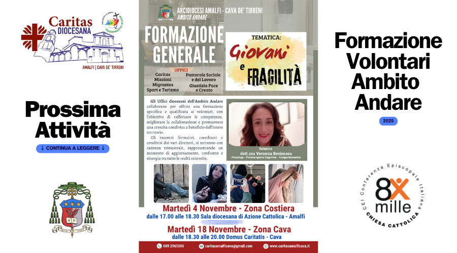La Caritas Diocesana, in collaborazione con l’Ufficio Missionario Diocesano, l’Ufficio Diocesano Migrantes, l’Ufficio per la Pastorale del Tempo Libero, Turismo e Sport, l’Ufficio per la Pastorale Sociale e del Lavoro e l’Ufficio per la Pastorale del Creato, propone un percorso formativo unitario rivolto a volontari, operatori pastorali e a quanti sono impegnati nei diversi ambiti del servizio ecclesiale.