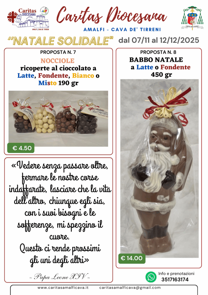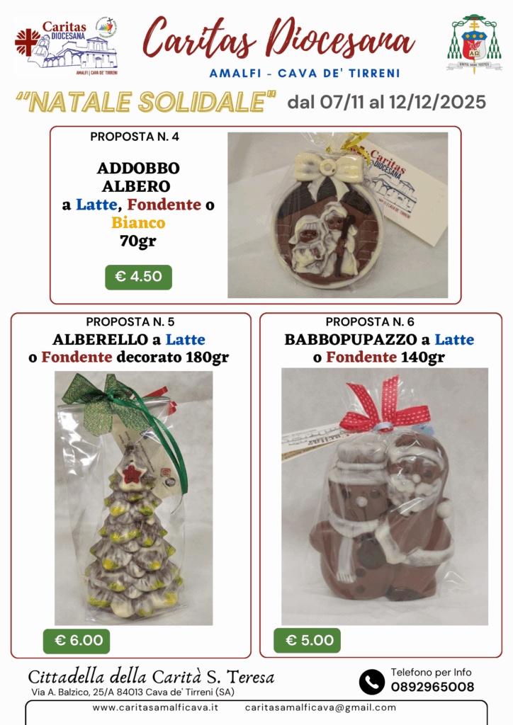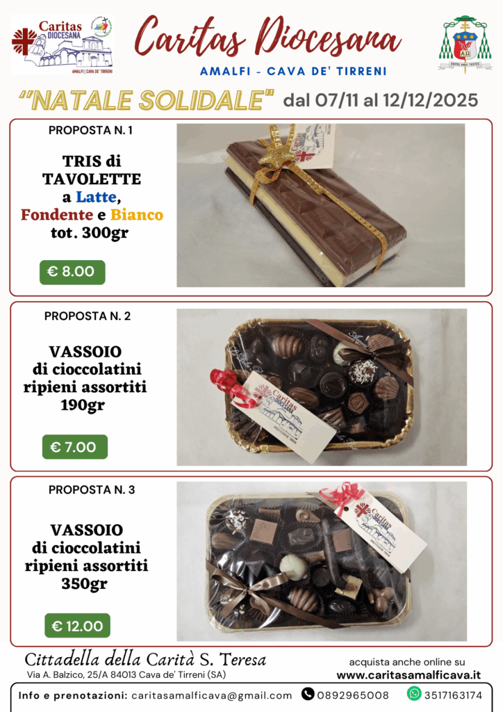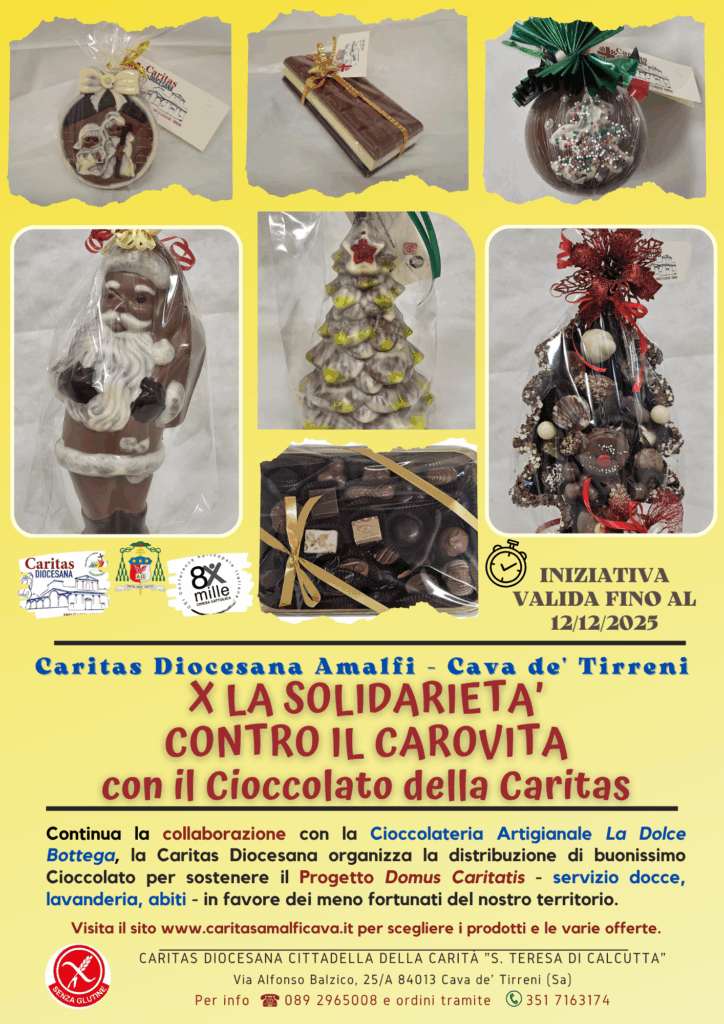 La Caritas diocesana anche per questo tempo di Natale 2025 propone il cioccolato artigianale di qualità, frutto del lavoro di una piccola azienda che condivide la stessa idea di rispetto e solidarietà. Non lo facciamo per vendere: lo facciamo perché ogni tavoletta può trasformarsi in un aiuto concreto per le persone più fragili che ogni giorno si affidano ai nostri servizi.